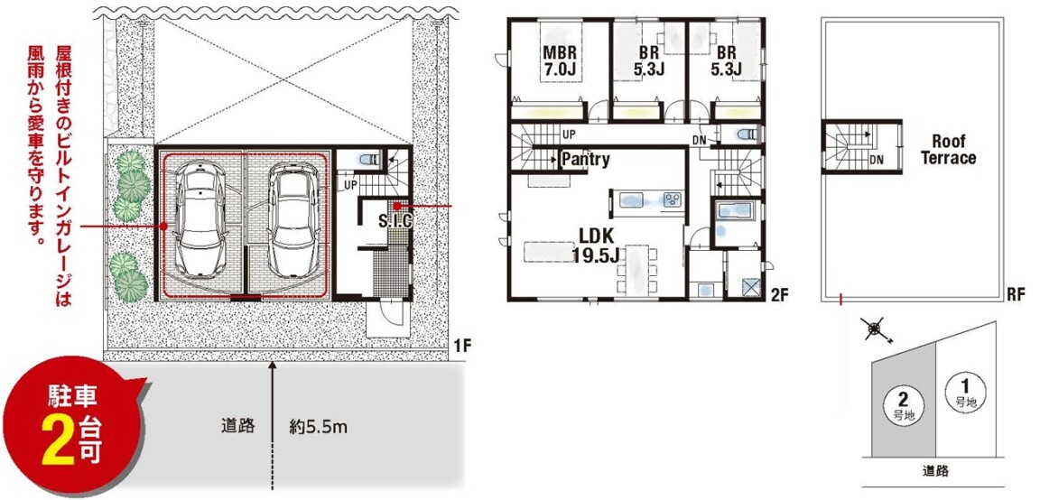 屋根付きビルトインガレージに2台駐車可能♪